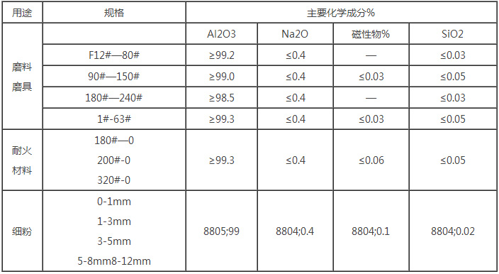 白剛玉以工業(yè)氧化鋁粉為原料,于電弧中經(jīng)2000度以上高溫熔煉后冷卻制成,經(jīng)粉碎整形,磁選去鐵,篩分成多種粒度,其質(zhì)地致密、硬度高,粒形成尖角狀,適用于制造陶 瓷、樹脂固結磨具以及研磨、拋光、噴砂、精密鑄造(精鑄專用剛玉)等,還可用于制造耐火材料 。